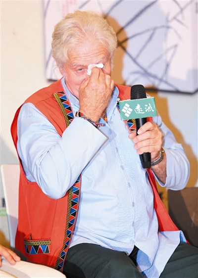 紐西蘭費爾在台北舉辦新書《眠月之山》記者會,對於台灣人的友善,不禁感動的流下淚來。江蕙無法到場,送花及卡片祝賀。圖/趙文彬