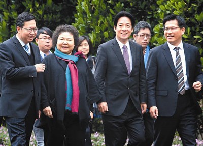 行政院昨天舉行六都市長就任後第一次行政院會,民進黨的桃園市長鄭文燦(左起)、高雄市長陳菊、台南市長賴清德、台中市長林佳龍在院會結束後一起步出行政院,並接受訪問,認為此次會議融洽,對地方與中央的溝通有很大幫助。圖/中央社