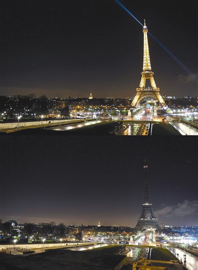熄燈悼念 巴黎著名地標艾菲爾鐵塔,於當地時間周四晚上八時熄燈,為諷刺雜誌《查理周刊》巴黎編輯部遇襲案中的死難者致哀。圖/歐新社