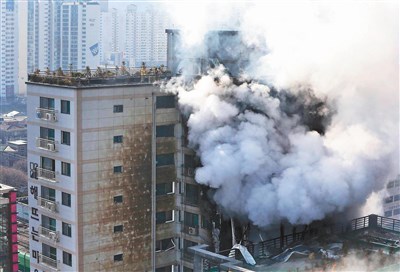 南韓首爾北部的京畿道議政府市一座十層樓公寓,昨天上午九時二十七分發生大火(見右圖/法新社),延燒至相鄰的兩棟十層和十五層小套房式住宅大樓,造成三人死亡、一百零一人受傷,其中七人性命垂危。