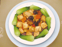 1.板豆腐切塊、香菇、辣椒、紅蘿蔔切片,青江菜汆燙擺盤備用。