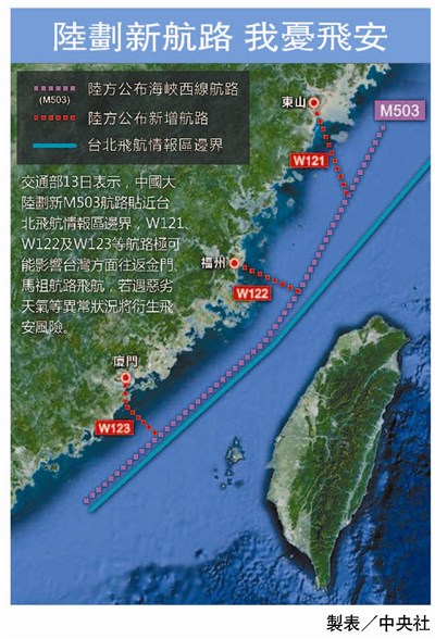 民航局長沈啟說,中國大陸因為內陸空域擁擠,為了分散民航機,在台灣海峽中線西側劃設南北向的M503航路,以及東西向的W121、W122、W123等三條航路,極可能影響台灣往返金、馬航路。兩岸雖然曾對新航路進行溝通,卻沒達成共識,中國竟透過國際民航組織運作,貿然劃設,並已在前天發布飛航公告,預定三月五日生效。