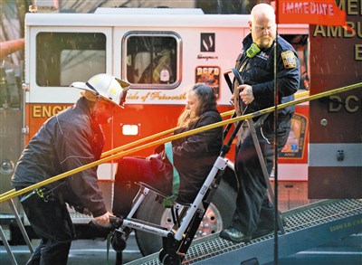 消防員用輪椅將一名受傷乘客推上救護車。圖/法新社