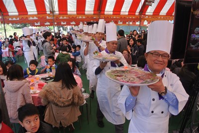 沈會承頭戴廚師帽、穿著白色廚師裝,帶領20多名幹部端盤表演上菜秀,讓坐在餐桌上的貴賓小朋友驚呼,「好帥喔!」菜剛上桌,馬上被學生吃光光。