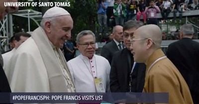 今天上午10時30分,教宗訪菲行程表排定在聖湯瑪斯大學進行跨宗教對話。教宗首先與宗教界領袖和代表一一握手,在走到覺培法師面前時,兩人熱絡交談1分多鐘,相較教宗與其他宗教領袖的交談時間,算是極長。