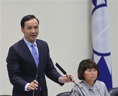 國民黨新任主席朱立倫(左)今天在中央黨部首度主持中常會,右為國民黨副主席黃敏惠。圖/中央社