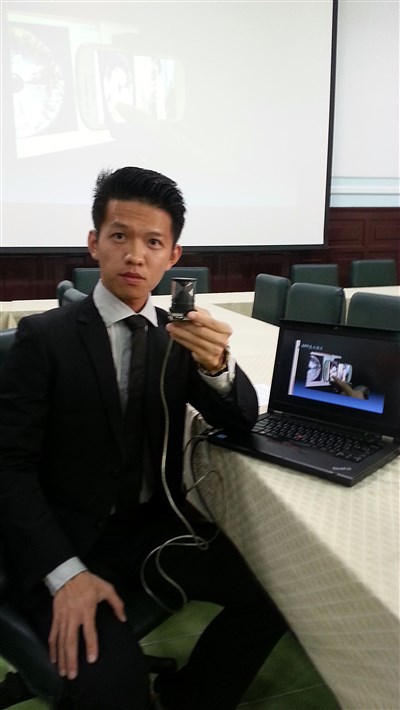 周文瑞表示,全景攝影系統利用影像感測器搭配曲面鏡,透過光反射成像搭配曲面鏡的特性,可拍攝360度的全景影像,同時開發App,結合全景攝影系統和行動裝置,未來可用在監控系統或居家安全監控照護系統,而模組成本僅約2000多元。