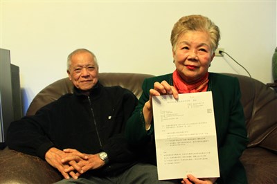 台北市長柯文哲的父親柯承發(左)、母親何瑞英(右)日前出示北區國稅局新竹分局的函文,指哪有父母借錢給自己的孩子還寫借據。圖/郭政芬