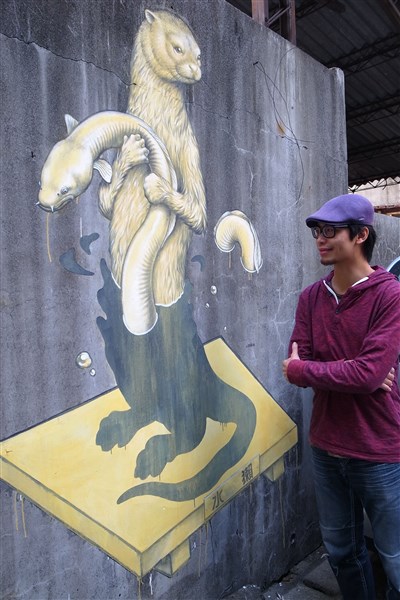 周明誼說,加蚋仔的故事很動人,據說新店溪過去水質清澈,有野生水獺、鱸鰻出沒,但因附近高樓建起,破壞當地生態。他便畫了一隻抓著鰻魚的水獺,下半身被做成標本,帶有警世意味。在資源回收場外的壁畫則以回收者為題,折得整齊的舊報紙、畫中的瓶瓶罐罐都是附近底層居民的額外收入。