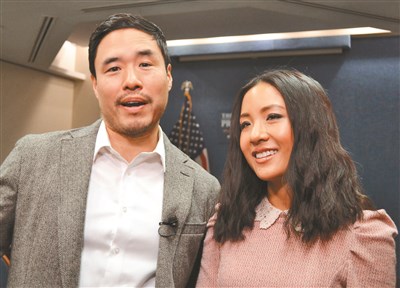 描述台灣移民故事的美國喜劇影集「菜鳥移民」將在美播出,21日在華府舉行新劇發表會。左起為男主角Randall Park、女主角吳恬敏。圖/許惠敏