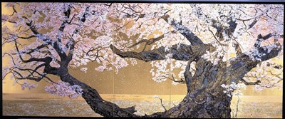 此次來台展出的畫作包含六幅櫻花版畫及二幅複製畫,其中一幅畫作《櫻花雙淨圖》,是為了陽明山花季特別製作,是一幅高一七九公分、寬八八○公分的日式櫻花屏風,來台展出的是複製畫。