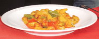 材料:猴頭菇一罐、青椒二十克、紅椒二十克、鳳梨二片、薑五克、紅辣椒一條、麵粉二○○克。