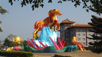 每年春節佛光山總是湧入大批人潮,主燈最受矚目。今年主燈以星雲大師新春墨寶「三陽和諧」為主題,設計高16公尺的巨型山羊花燈,為展現高雄水果王國的美名,周遭還有許多旗山香蕉、燕巢棗子等水果造型燈飾,相當特別。除了主燈外,今年佛光山還與新竹監獄合作,展示歷年參加花燈比賽的作品,燈區名為「轉迷為悟」。