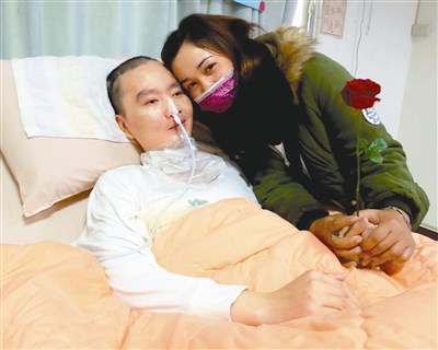 因車禍昏迷不醒近四年的郭豐鑫(左),住進創世鳳山院,在太太不離不棄及護理人員用心照顧下,去年十月開始恢復知覺,郭太太昨天帶著玫瑰花提早和他共度情人節,郭豐鑫也露出笑容。