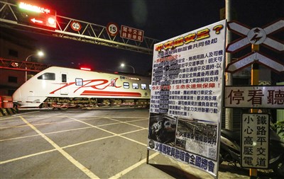 台鐵司機員發起通過平交道減速活動,在台北板橋到樹林間的俊英街平交道旁,放置標語,提醒駕駛注意,捍衛平交道行車安全。圖/楊萬雲