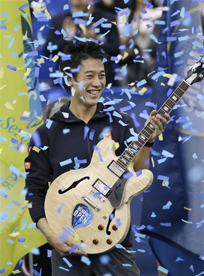 世界排名第5的日本選手錦織圭,16日在曼菲斯公開賽冠軍賽以連2盤6比4擊敗第2種子南非Kevin Anderson,是連續3年贏得這項比賽的冠軍。圖/美聯社