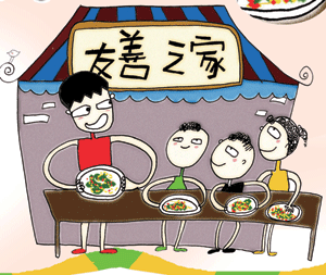 「阿傑!你有沒有覺得來這裡用餐的人,比較友善,比較有禮貌?」小媛觀察敏銳的對你說。「是呀 !每個人都露出和藹可親的笑容,還有你們看……」小敏驚喜的發現牆上的匾額,大家循著她手指的方向望去。