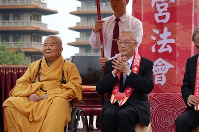 【本報高雄訊】佛光山2015地宮珍寶入宮暨百萬心經入法身法會,今天上午在佛陀紀念館菩提廣場舉行,佛光山開山星雲大師說明地宮珍藏寶物的由來與重要性,副總統吳敦義應邀見證寶物入地宮歷史的一刻。