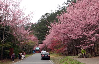 武陵農場上萬株櫻花怒放,今天吸引民眾上山賞櫻,車輛絡繹不絕。圖/勝光派出所提供