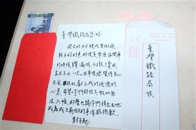 彰化縣一名男子多次搭區間車逃票,最近良心發現,主動寫信並附上一張千元鈔票給鐵路局表達歉意。圖/何炯榮