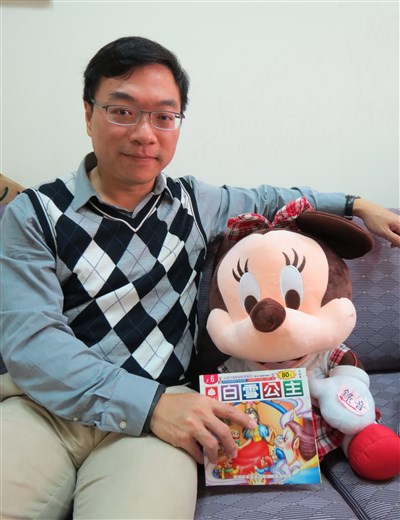 弘光科大資工系副教授童建樺,研發「親子共讀故事機」,讓孩子只要用故事書感應卡通玩偶,就能聽到父母錄下的故事內容。圖/弘光科大提供