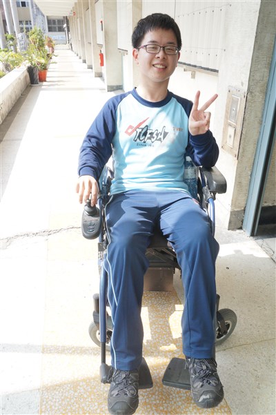 中一中陳宥廷天生腦性麻痺,他學測考73級分,想申請讀電機系,發明身障輔具。圖/喻文玟