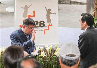 台北市長柯文哲(左)上午陪同父母以二二八事件受難者家屬身份出席二二八事件追悼紀念會,上台致詞時情緒激動;致詞後馬英九總統(右)起身向柯致意,兩人並無握手。圖/鄭清元