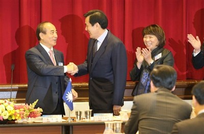 馬英九總統(左二)出席國民黨在國家政策基金會舉行「立法行政部門議事運作研討會」,他向先到場的立法院長王金平(左一)握手,受到與會者鼓掌歡迎。圖/黃義書