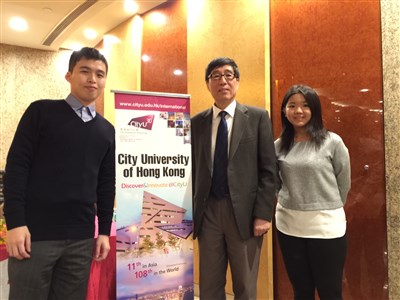 香港城市大學校長郭位(中)親自來台招生,昨天帶領兩位香港城市大學畢業的台灣學生現身說法。圖/林秀姿
