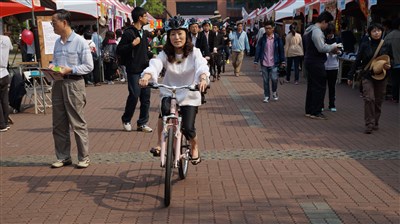 成大舉辦單車節,提供單車讓學生免費租借,漫遊在成大各校區之間,成大校長蘇慧貞也和學生們一起單車趴趴走。圖/鄭宏斌