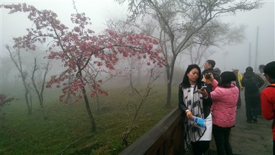 細雨白霧中阿里山櫻花季開鑼。圖/卜敏正