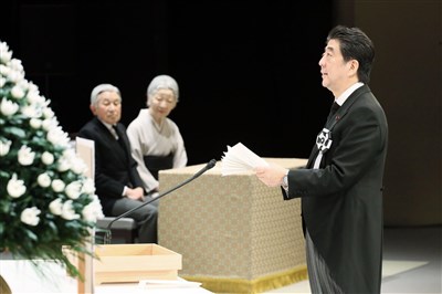 日皇明仁和皇后美智子今天出席在國立劇場主辦東日本大地震悼念儀式,首相安倍晉三儀式上致辭。圖/中央社