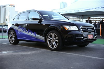 Delphi準備14日在德州奧斯汀的「西南偏南」藝術節上展示其中一款自動駕駛車,這部Audi Q5休旅車配備雷射感應器、雷達與多具攝影機。