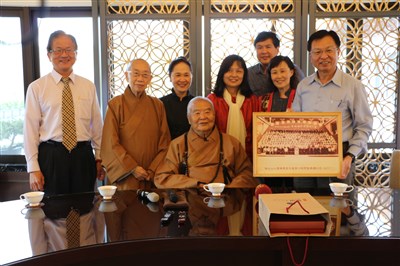 42年前佛光山大專佛學夏令營學員佛光山聚首,把拍攝於1975年的第六期學員合照獻給星雲大師(中坐者)。站立者左起:佛光山榮譽功德主蔡國華、佛光山開山寮特助慈惠法師、佛光山檀講師趙翠慧、佛光山榮譽功德主陳素雲、成功大學醫學院教授張玉川、嘉南藥理科技大學教授蔡珍瑋、中油董事長林聖忠。 圖/人間社記者徐芷齊