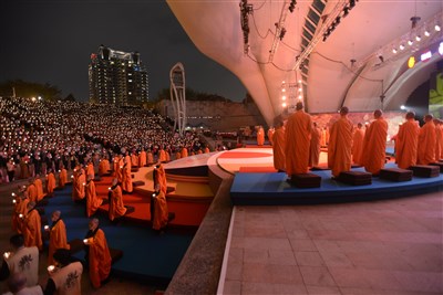接續由法師齊擊法鼓,結合國樂團及天鼓擊樂團表演,展現「龍騰虎躍」的氣象萬千,震撼全場感動人心。在梵唄中,百位法師依序進場,主法三大師薰壇灑淨,帶領大眾請聖、啟告十方、懺悔發願、拜願等。在傍晚時分,當萬盞燭光亮起,大眾用虔誠的心,祈願能在佛陀加被下,發心立願找回自我的本性,讓苦海眾生獲得點亮光明的希望,在場不少民眾被肅穆的氛氣感動,流下法喜淚水。