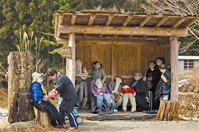 日本藝術家綾野月美從大阪搬回故鄉名頃,為家裡的田畝縫製一尊與父親酷似的布娃娃。人口外移與高齡化的雙重打擊,讓曾有數百人居住的名頃地區如今只剩三十七個人。因為村子太寂寞了,綾野月美開始縫製各式各樣的布娃娃,有持鐮刀的農婦、爬樹的男孩、看報的夫婦等。圖/路透