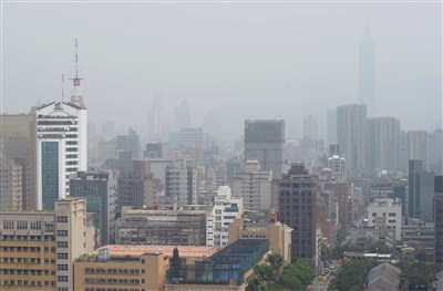 今天台北的天空有些霧茫茫,遠眺台北東區霧茫茫一片,視野不佳。圖/中央社
