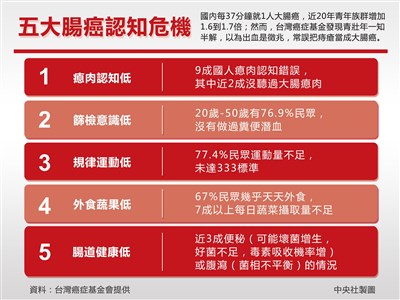 【本報台北訊】國內每37分鐘就1人大腸癌,雖然大腸癌好發於50歲以上病患,近20年青年族群增加1.6到1.7倍,然而,已引起醫界的重視。台灣癌症基金調查發現,青壯年對大腸癌一知半解,以為出血是徵兆,常誤把痔瘡當成大腸癌。