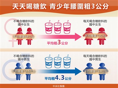 【本報台北訊】醫學界調查,每天喝含糖飲料的國中生,平均腰圍會比不喝的同學至少粗3公分,亂吃零食或偏食者,發生代謝症候群病機率也高出9.3倍
