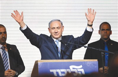 以色列總理納坦雅胡領導的聯合黨贏得國會大選,十八日在特拉維夫的政黨總部揮手答謝選民支持。