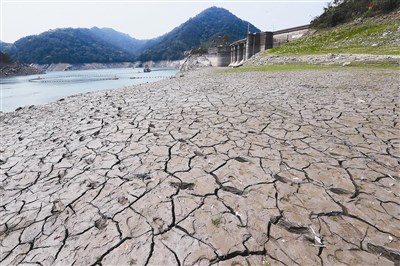 旱災中央災害應變中心昨天決定,石門水庫供水區包括新北板新與林口、桃園地區,自四月一日起實施第三階段限水,將採供五停二模式。圖為昨天石門水庫大壩碼頭旁已露出大片龜裂的土地。圖/高彬原