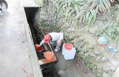 苗栗縣銅鑼鄉客家大院旁的龍泉水質甘甜,平常就吸引許多民眾前往取水。近來久旱不雨,水量大減,水位幾乎不到二十公分,取水民眾用盡方法多裝幾桶水備用,甚至有水商直接來這邊載水販售,宛如一場搶水大作戰。圖/中央社