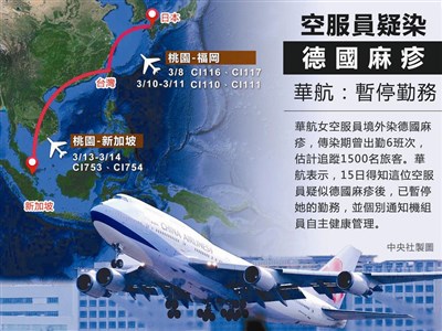 莊人祥說,該名空服員十四日因發燒、流鼻水、咳嗽及出疹,隔天至醫學中心就醫,十八日確診感染德國麻疹,目前仍住院隔離中。疾管署查無該空服員接種疫苗紀錄,推測她於二月底來回越南、印尼及香港等地而感染,應是從境外移入。疾管署疫調發現,本國籍接觸者有六百八十六名,已掌握二百二十九人預計追蹤至四月十一日。同航班的八百七十二名外籍乘客,來自十一個國家,疾管署將透過國際衛生條例國家對口單位(IHR FocalPoint)通知相關國家。