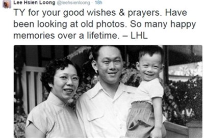 李光耀連日來病情嚴重,李光耀兒子、現任總理李顯龍在臉書(facebook)貼上一張兒時與父親和母親柯玉芝的黑白家庭照,感謝各界對父親的祝福。
