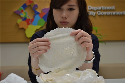 新北市政府衛生局公布查獲2業者涉在潤餅皮添加俗稱「吊白塊」的工業用漂白粉,添加後可讓潤餅皮更Q彈。圖/中央社