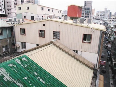 台北市林森北路一百三十三巷這棟違建,從三樓加蓋到五樓,隔成套房出租,從旁邊看都是鐵皮蓋成的。屋主在昨天下午大限前趕工完成改善,經勘察確認後解除列管。圖/高宛瑜
