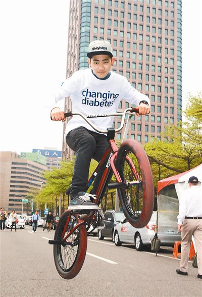 【本報台北訊】十九歲糖尿病友劉全銘,小六開始練習極限單車,曾在練習時暈眩,也曾因沒打胰島素酮酸中毒,卻沒有打倒他挑戰極限的努力,在國內外賽事拿下不少獎項。