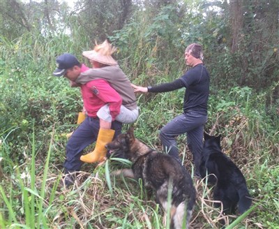 【本報高雄訊】陳姓老農在高雄市旗山區失蹤2天,高雄市消防局派出特搜中隊及3隻搜救犬協尋,搜救犬穿叢越林,披荊斬棘尋獲87歲老農建功。