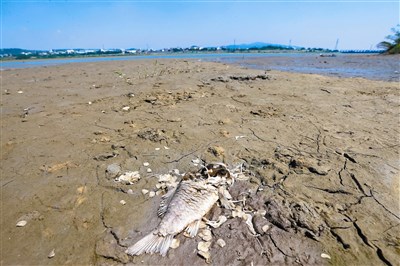 板新水廠蓄水區沿岸原本覆滿水源的區域,部分剩涓涓細流、部分已乾涸,水情相當吃緊。圖/王騰毅