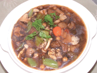 素貢丸、芥菜、竹笙、洋菇、小杏菇、素羊肉各一○○克。天山雪蓮子、鳥嘴豆、髮菜各五十克。紅蘿蔔球八粒、新鮮香菇三朵。